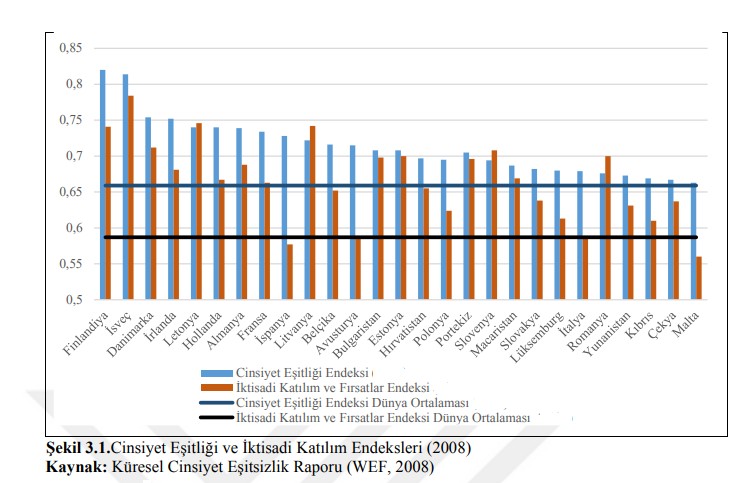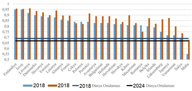 AB ülkelerinin 2024 yılındaki cinsiyet eşitliği ve iktisadi katılım endekslerinin değerleri aşağıdaki Şekilde gösterilmiştir. Grafiğe göre 2024 yılında AB ülkelerinin cinsiyet eşitsizliği endeksi genel olarak Dünya ortalamasının üzerinde seyretmiştir. Yalnızca Kıbrıs (0,669), Çekya (0,667) ve Malta (0,663) için oranlar neredeyse Dünya ortalamasına (0,659) eşit çıkmıştır. Bu ülkelerin Avrupa Birliği’ne 2004 ve sonrasında üye olan ülkeler arasında olmaları bu sapmayı açıklamaktadır. Birliğe daha eski tarihlerde üye olan ülkeler ile yeni ülkeler arasında 2008 yılı itibariyle ciddi farklar bulunmaktadır. İktisadi katılım ve fırsatlar endeksine göre Avusturya (0,587), İtalya (0,587), Malta (0,663) ve İspanya (0,577) dışındaki ülkeler Dünya ortalamasının (0,587) üzerinde seyretmiştir. 2024 yılı itibariyle Litvanya ve Letonya hariç, AB ülkelerinde iktisadi katılım ve fırsatlar endeksi cinsiyet eşitliği endeksinden daha yüksek gerçekleşmiştir. Bu durum, AB’ye üye olan ülkelerde cinsiyet eşitliğinin diğer boyutları olan sağlık ve eğitimde cinsiyet eşitliğinde iktisadi eşitliğe göre daha ileride olduklarını göstermektedir.