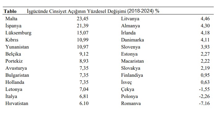İşgücünde cinsiyet açığı basitçe kadınların ve erkeklerin işgücüne katılım oranlarının bölümüdür. Bu gösterge, kadınların işgücü piyasasına girmelerine engel olan unsurların bir çıktısı olduğundan toplumsal cinsiyet çalışmalarında en önemli gösterge olarak karşımıza çıkmaktadır. Bu göstergenin bire yakın olması kadınların erkekler kadar emek arz edebildiklerini ve bunun karşısında engellerin az olduğu anlamına gelmektedir. Şekilde gösterildiği üzere işgücünde her iki yılda da cinsiyet açığının en düşük olduğu ülkeler İsveç(0,95-0,96) ve Finlandiya (0,95-0,96) olmuştur. Her iki yılda da bu göstergenin en düşük gerçekleştiği ülkeler sırasıyla Malta (0,55-0,68) ve İtalya (0,69-0,74) olmuş ve 2008 yılında dünya ortalamasının (0,69) altında kalmışlarken, 2024 (0,67) yılında ortalamanın üzerine çıkmışlardır. 2018-2024 arasında işgücünde cinsiyet açığındaki değişimi gösteren aşağıdaki tabloya göre işgücünde cinsiyet açığını en yüksek oranda kapatan ülke Malta olmuştur. Çekya, Polonya ve Romanya’da ise açık 2024 yılında 2018 yılına göre açılmıştır. İktisadi katılım ve fırsatlar endeksinde ortaya çıkan örüntü burada daha net görülmektedir. İşgücünde cinsiyet açığını en hızlı kapatabilen ilk beş ülkeden dördü küresel turizm merkezlerinden sayılan Malta, İspanya, Kıbrıs ve Yunanistan olarak karşımıza çıkmaktadır. Bu bağlamda yatay katmanlaşma nedeniyle ağırlıkla kadınların çalıştığı turizm sektöründe yaratılan istihdam olanaklarının kadınların işgücüne katılımını olumlu etkilediği sonucu çıkabilir.
