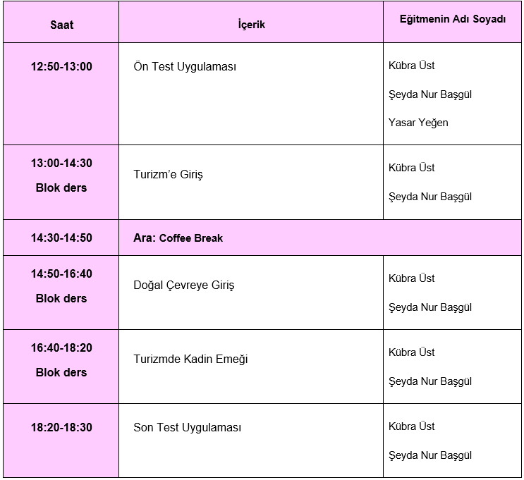 Turizm Sektöründe Cinsiyet Eşitliği Projesi Kuluçka Merkezi Eğitim Organizasyonu Günlük Programı